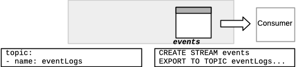 For output, you include the EXPORT TO TOPIC clause when you declare a stream or table. Once the schema object includes the EXPORT TO TOPIC clause and the topic is defined in the configuration, any records written into the stream or table are made available to consumers through the topic port.